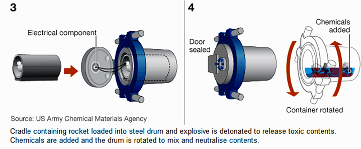Στη διαδικασία αυτή κάθε βόμβα κόβεται χειρωνακτικά μέ ένα τροχό στο πάνω και στο κάτω μέρος της με σιδηροπρίονο για να αποχωρισθεί το άνω κομμάτι της με το αισθητήρα της πρόσκρουσης και το κάτω κομμάτι της με το εκρηκτικό, που συνεισφέρει στη θέρμανση των αρχικών αντιδραστηρίων που δημιουργούν το ισχυρό τοξικό χημικό. ...