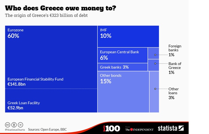 Σύμφωνα με το διάγραμμα που παρουσιάζει ο Independent, η Ελλάδα οφείλει: το 60% στην Ευρωζώνη (η πρώτη φάση περιελάμβανε την παροχή δανείων στην Ελλάδα ύψους 110 δισ. ευρώ εκ των οποίων τα 80 προέρχονταν από τα 15 κράτη της Ευρωζώνης).