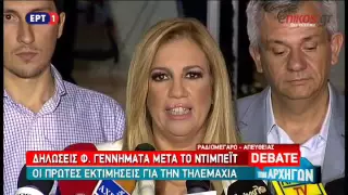 «Δεν θα περιμένω να το ακούσω. Πρέπει να δράσουμε. Το προηγούμενο διάστημα ήταν αδράνεια. Ακούσαμε απίστευτα πράγματα: λιάζονται ότι στήριξαν την τοπική οικονομία. Πρέπει να πείσουμε την ΕΕ ότι έχουμε ευρωπαϊκό πρόβλημα και όχι ελληνικό. Η ελλάδα δεν μπορεί να αντιμετωπίσει μόνη της το πρόβλημα. Εχουμε ζητήσει διακομματική συνεργασία για υποδομές. Φαίνεται ότι υπάρχουν βήματα προόδου στην ΕΕ αλλά λόγω αδράνειας της προηγούμενης κυβέρνησης δεν υπάρχει οργάνωση, δεν έχουν διαχωριστεί οι πρόσφυγες δεν υπάρχουν υποδομές και χρήματα και δεν θα μπορέσουμε να συμμετέχουμε στο ευρωπαϊκό πρόγραμμα» απάντησε η Φώφη Γεννηματά και πρόσθεσε πως απαιτείται «ριζική αλλαγή της ΕΕ στο θέμα των προσφύγων με σεβασμό στα ανθρώπινα δικαιώματα και στα ελληνικά νησιά. Η κυβέρνηση οφείλει να προχωρήσει σε επικοινωνιακή ανάδειξη επικοινωνιακή των νησιών αυτών γιατί τώρα κλείνονται τα τουριστικά».