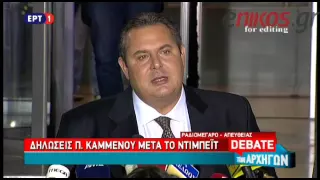 Διαφώνησε πλήρως για το θέμα της ιθαγένειας ο Πάνος Καμμένος, όπως αποκάλυψε κατά κατά διάρκεια του ντιμπέιτ και δήλωσε μάλιστα ότι αν είχε το δικαίωμα βέτο θα το είχε θέσει. Για το θέμα του μεταναστευτικού, ο πρόεδρος των Ανεξάρτητων Ελλήνων δήλωσε ότι το πρόβλημα δεν είναι μόνο οι πρόσφυγες είναι και οι λαθρομετανάστες, καθώς, όπως είπε, οι πρώτοι θα φύγουν προς την Ευρώπη. «Δυστυχώς επιβεβαιώθηκα για τους πρόσφυγες», τόνισε ο Καμμένος. Πρότεινε παράλληλα τα νησιά αυτά να κηρυχθούν σε κατάσταση έκτασης ανάγκης, να ενισχυθούν οικονομικά και να μπουν περισσότερα πλοία για να μεταφέρονται από τα νησιά και να καταγράφονται μέσα στα πλοία. “Το φαινόμενο είναι τεράστιο” τόνισε. “Πρέπει να ξεχωρίσουμε τις πολιτικές μας για τους πρόσφυγες και τους λαθρομετανάστες”, ανέφερε, επίσης, και τόνισε ότι η Ευρώπη μέσω της Γερμανίας ήρθε να μας απειλήσει για τους πρόσφυγε.