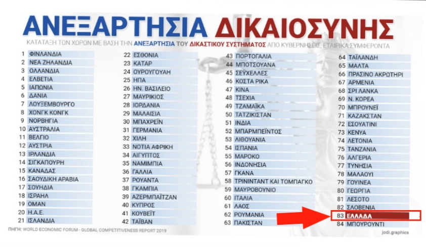 Από το 2019, η κατάταξη της χώρας στους δείκτες Δικαιοσύνης οδεύει όλο και περισσότερο προς τα κάτω. Στην 83η θέση βρισκόταν η Ελλάδα σε σύνολο 141 χωρών στον δείκτη της ανεξαρτησίας της δικαιοσύνης, το 2019. Τα στοιχεία προέρχονται από την έκθεση του World Economic Forum. Σημειώνεται ότι το 2017-2018, η Ελλάδα βρισκόταν στην 71η θέση.